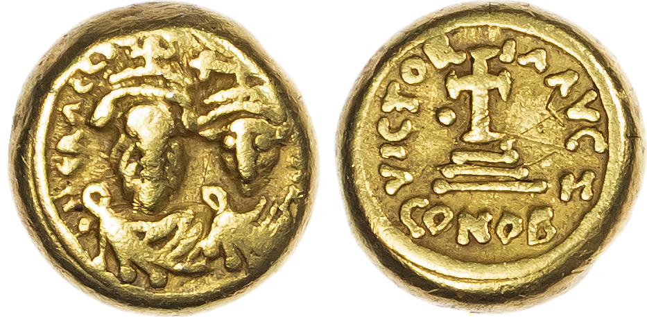 Heraclius, with Heraclius Constantine (AD 610-641) AV Globular Solidus, Carthage, AD 620/1, 4.41g. D N ЄRACLIO [ЄT ЄRA COS P P M], crowned, facing busts of Heraclius (left) and Heraclius Constantine (right), cross between. Rev. VICTORIA AVGG M, cross potent on two steps, CONOB in exergue. (Sear 867). Fine.