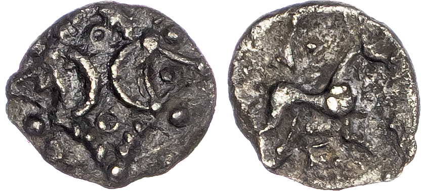 Iceni, Anted (c. AD 10-30) AR Half Unit, ‘Mini Anted’ type, 0.34g. Back-to-back crescents and lozenge of corded lines. Rev: Stylised horse right, ANTED (monogram) below. (ABC 1648; VA 720-1; BMC 4028-31). Good Very Fine for issue. Extremely Rare.