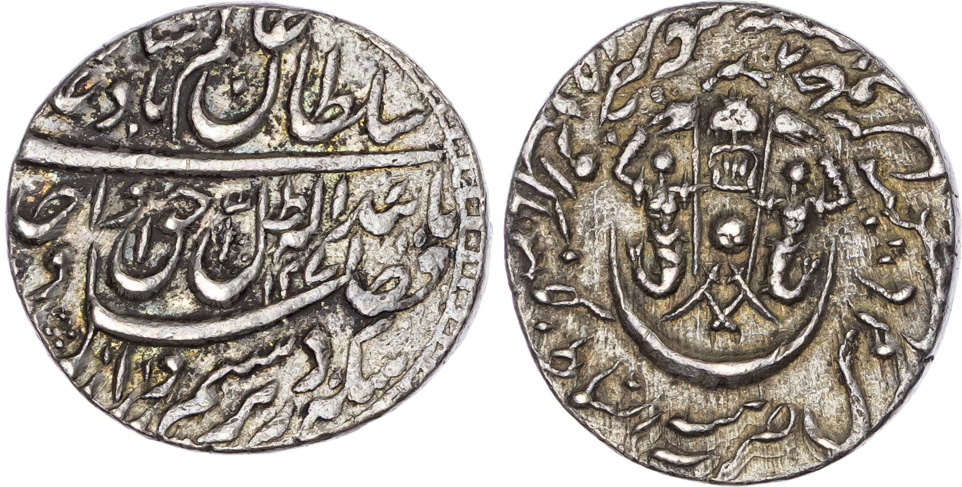 India, Awadh, Wajid Ali Shah (AH 1263-1272 / 1847-1856 AD), silver Rupee, AH 1271 / 1854/5 AD, RY 8, Muhammadabad Banaras, 11.13g (KM 365.1). Good Very Fine, some staining.
