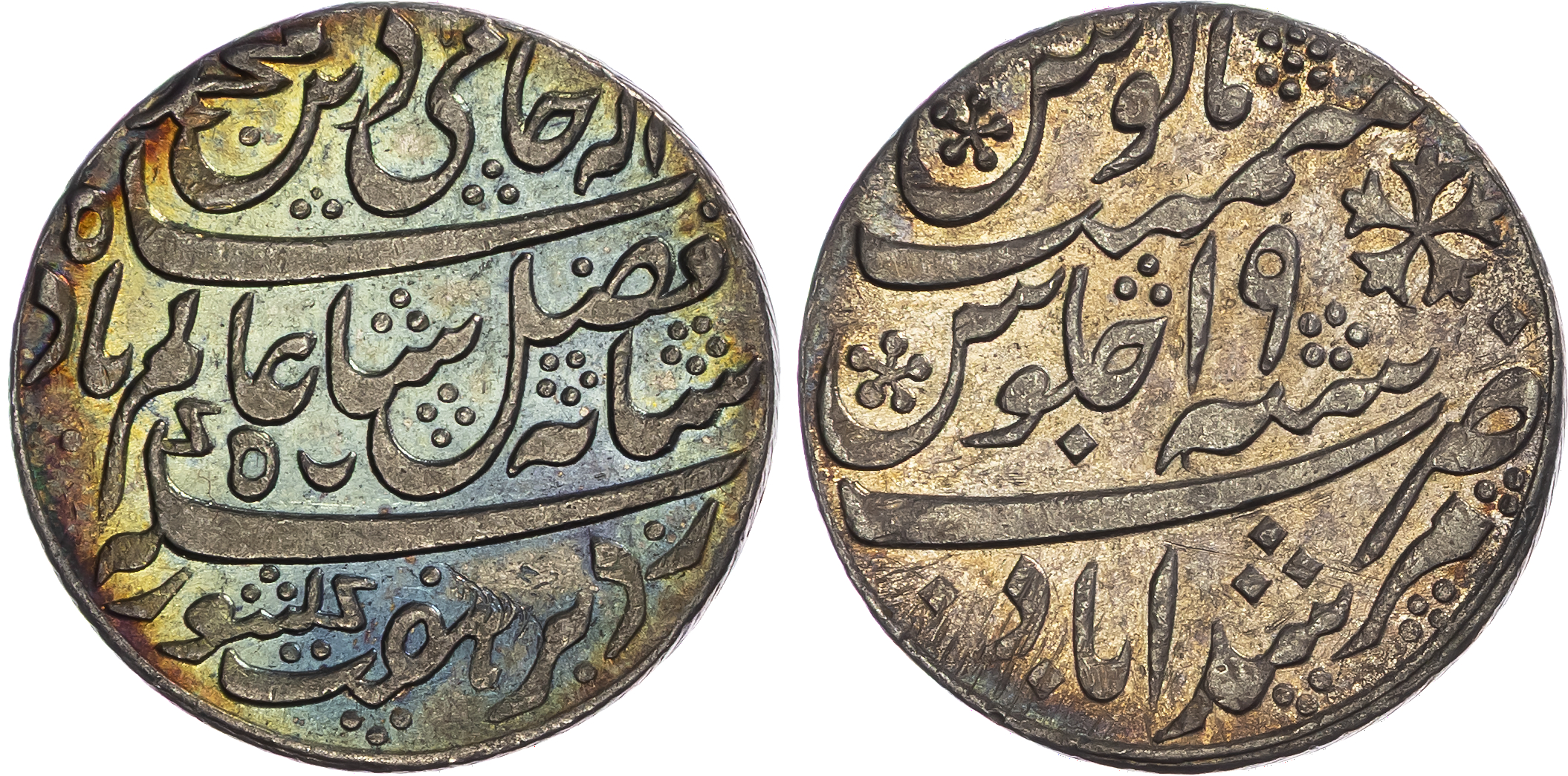 India, Bengal Presidency, silver Rupee, in the name of Shah Alam II, year 19 – frozen year, Calcutta, c. 1794-1818, 11.58g (KM 106). Good Extremely Fine, beautiful toning.