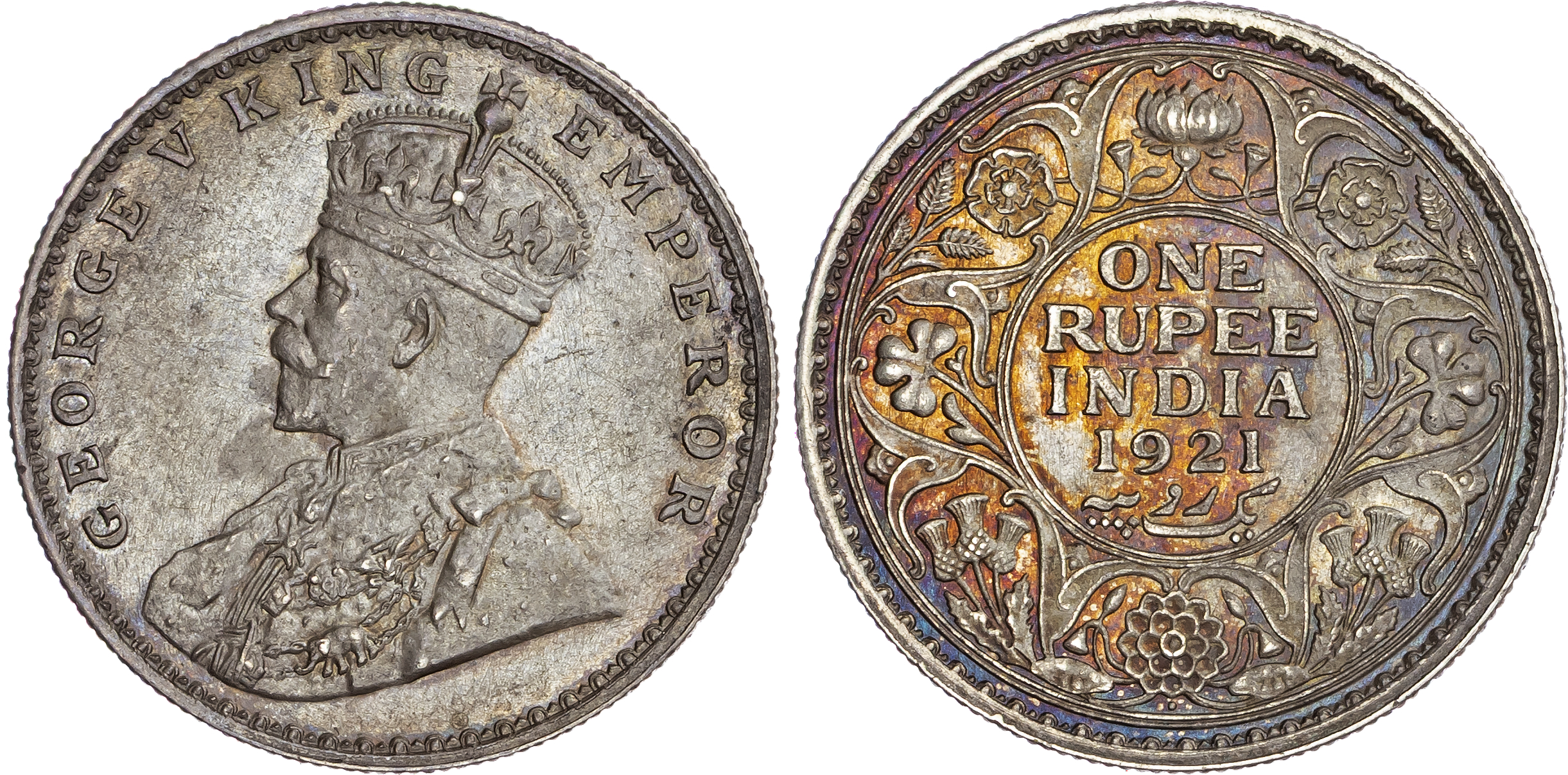 India, George V (1910-1936), silver Rupee, 1921, Bombay, 11.67g (KM 524). About Extremely Fine, cleaned.