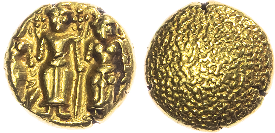 India, Madras Presidency, gold Pagoda, Three Swami type, struck c. 1691-1740, Fort St. George (Tegnapatnam), 3.42g (Fr. 1572; Prid. 3A). About Extremely Fine.