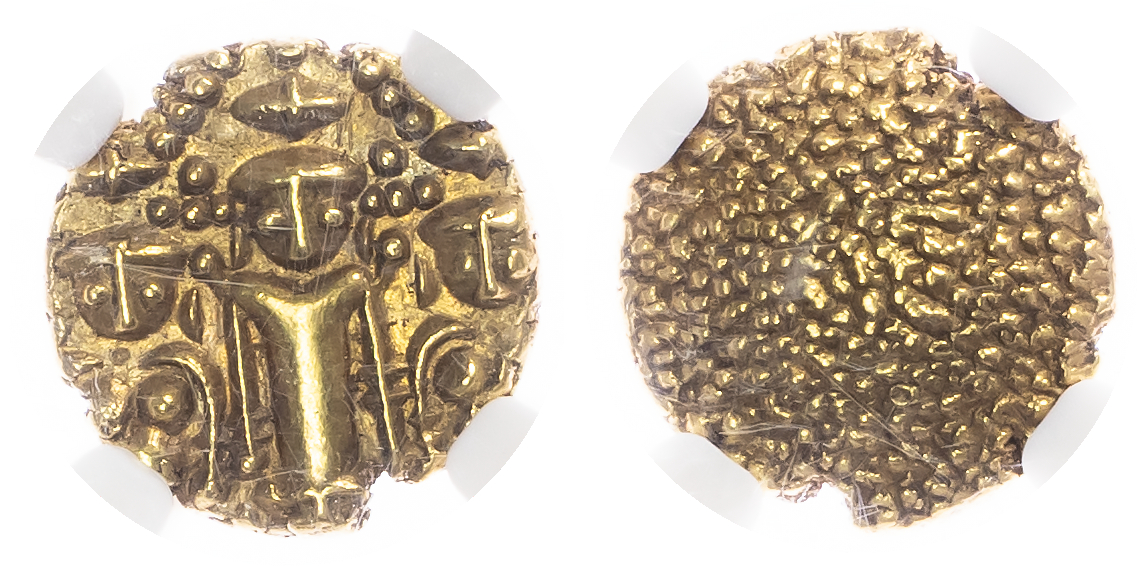 India, Madras Presidency, gold Pagoda, Three Swami type, 1740-1807, Fort St. George (Tegnapatnam), 3.41g (Fr. 1575; Prid. 3B). In NGC holder graded AU 58 (6381363-001).