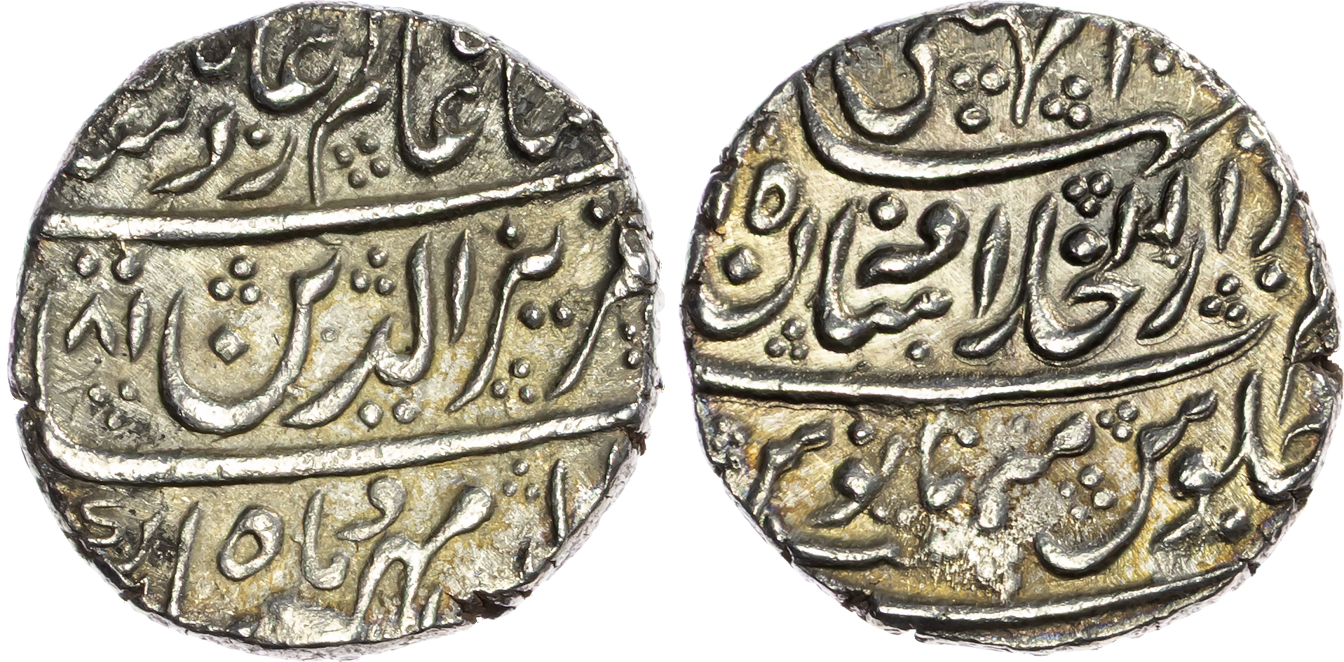 India, Maratha Confederacy, silver Rupee, AH 1181 / 1767/8 AD, RY 15, Athni (Shahjahanabad) mint, 11.22g (KM 226). Extremely Fine.