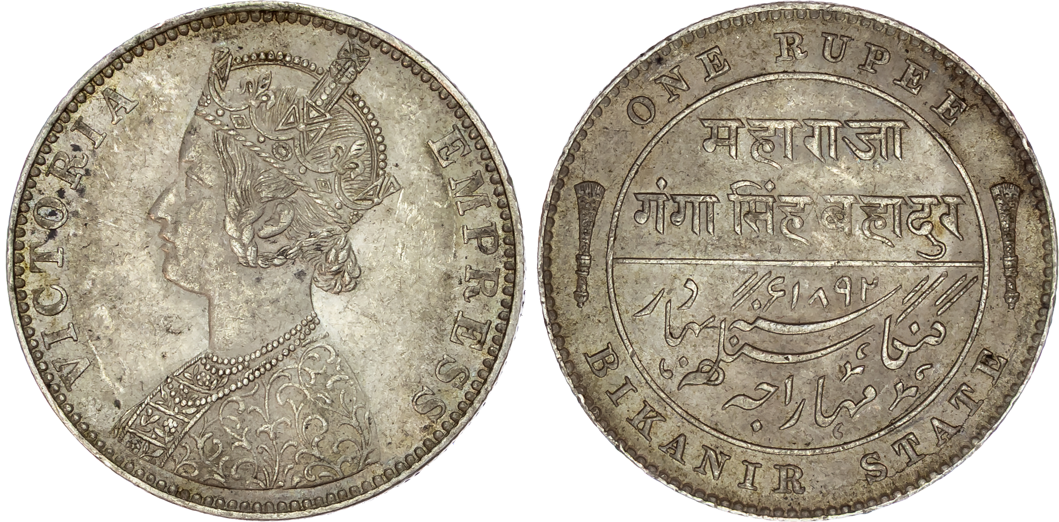 India, Princely States, Bikanir, Victoria (1837-1901), silver Rupee, 1892, 11.69g (KM 72). About Extremely Fine, some surface marks.