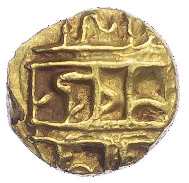 India, Vijayanagar, Achyutaraya (1530-42), gold Half Pagoda, Gandabherunda type, Gandabherunda (double-headed eagle) standing left. Rev. Legend in Devanagari, 1.70g (Fb. 756).