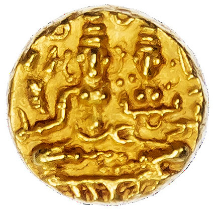 India, Vijayanagar, Hari Hara II (1377-1404), gold Half Pagoda, Umamaheswara type, 1.69g (MNI 877).