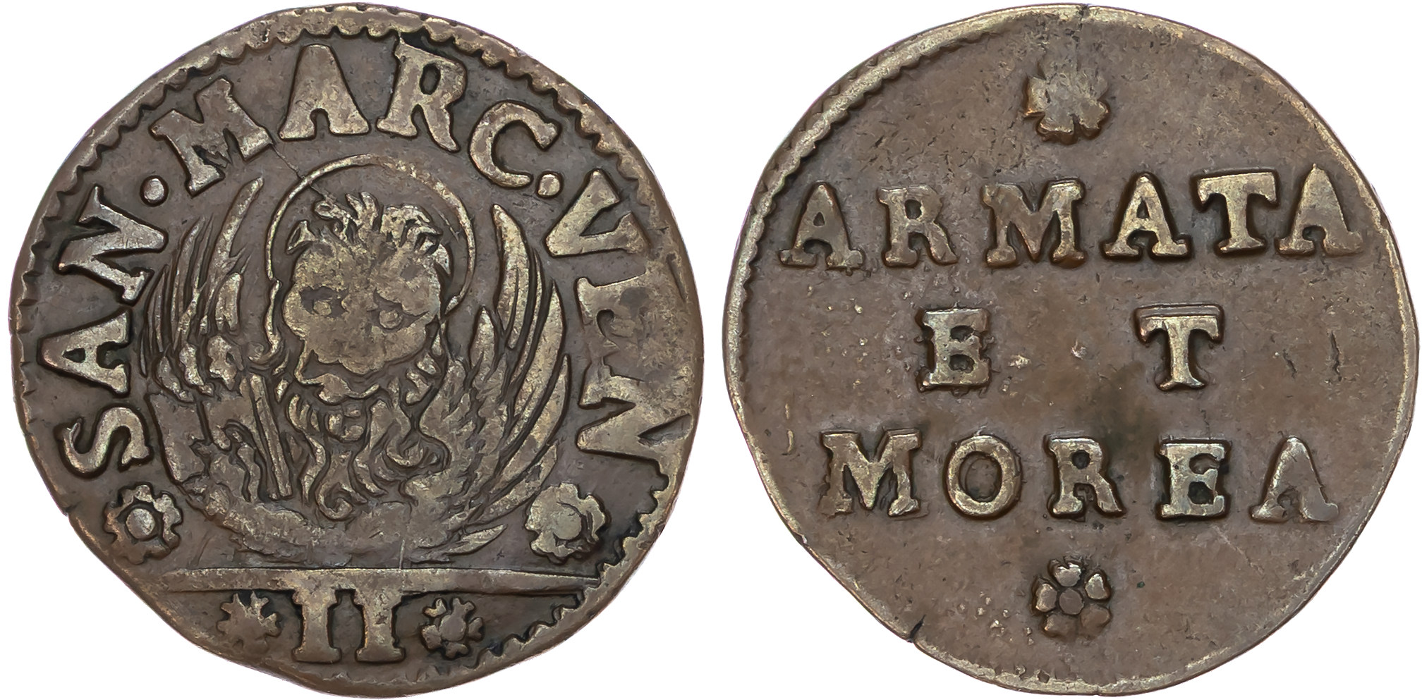 Italy, Venice, Armata & Morea, copper 2 Soldi, c. 1688-1690, 6.81g (KM 2). Very Fine.