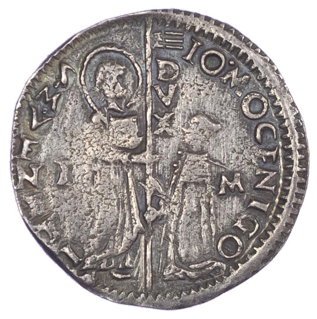 Italy, Venice, Giovanni Mocenigo (1478-1485), silver ½ Lira, St. Mark standing right, presenting banner to Doge kneeling left; I to left, M to right. Rev. Christ Pantokrator enthroned facing, 3.22g (Mont. 230).