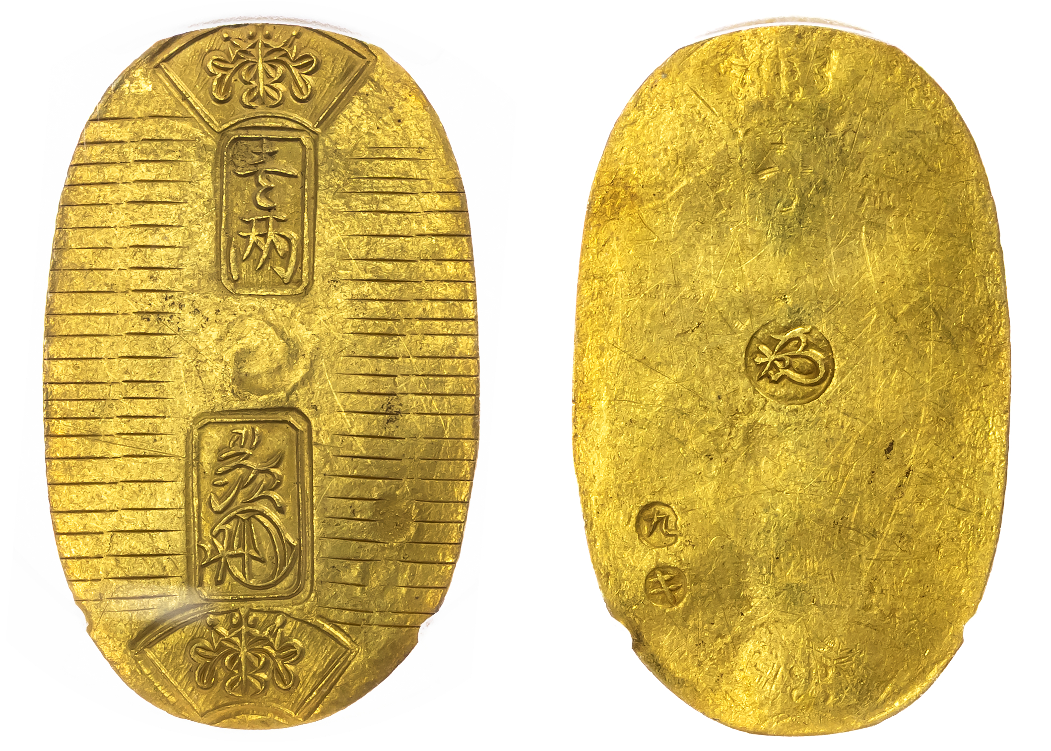 Japan, Manen (1860-1867), gold Koban, fan-shaped Kiri crest at the top and bottom, with two Japanese characters in panel below with value, with characters in the second panel for the… Read more
