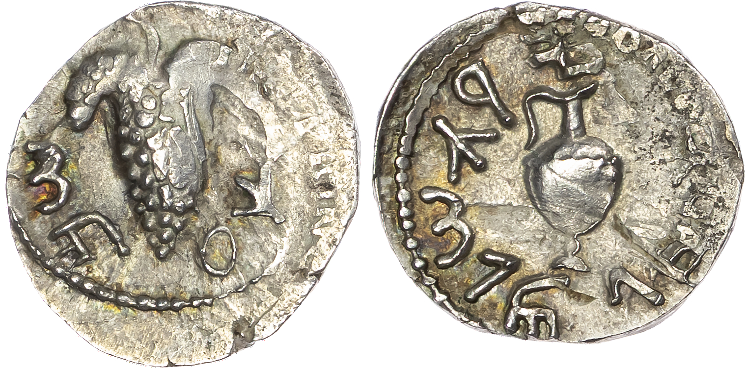 Judaea, Bar Kokhba Revolt (132-135 CE) AR Zuz, Undated Year 3 (134/5 CE), Jerusalem, 3.50g. Bunch of grapes. Rev. Fluted jug with handle. (Mildenberg 163; Hendin 6460). Extremely Fine for issue.