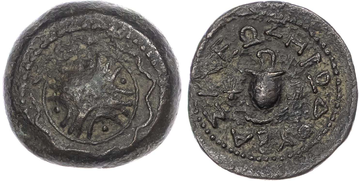 Judaea, Herod I (the Great) (40-4 BCE) AE 3 Prutot, Sebaste, dated RY 3 (38/7 BCE), 4.68g. Macedonian shield with decorated rim. Rev. ΗΡΩΔΟΥ ΒΑΣΙΛΕΩΣ, crested helmet, LΓ to left. (RPC I, 4902; Hendin 6205). Good Very Fine.