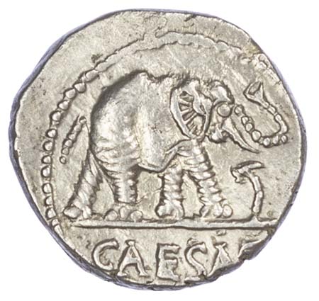 Obverse: Elephant advancing right, trampling a serpent, CAESAR in exergue.