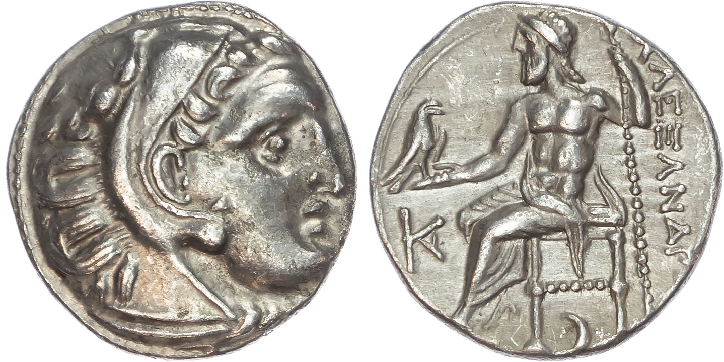 Kingdom of Macedon, Alexander the Great (336-323 BC) Silver Drachm, posthumous issue, Kolophon, c. 310-301 BC, 3.98g. Obverse: Head of Herakles right, wearing a lionskin headdress. Reverse: ΑΛΕΞΑΝΔΡΟΥ, Zeus seated left, holding eagle and sceptre, KA monogram to left, crescent below throne. (Price 1825). About Extremely Fine.
