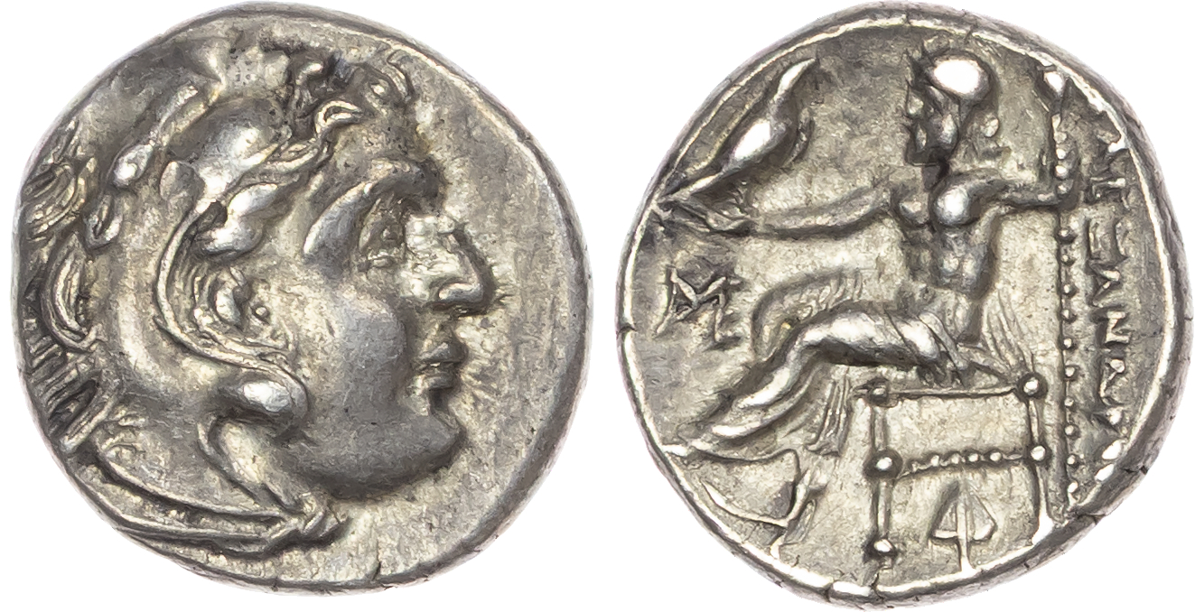 Kingdom of Macedon, Alexander the Great (336-323 BC), Silver Drachm, Posthumous Issue, Abydos, 310-301 BC, 4.29g. Obverse: Head of Heracles right, wearing lion skin headdress. Reverse: Zeus seated left, holding eagle and sceptre, ME monogram in left field, ivy leaf below strut. (Price 1560).Good Very Fine.