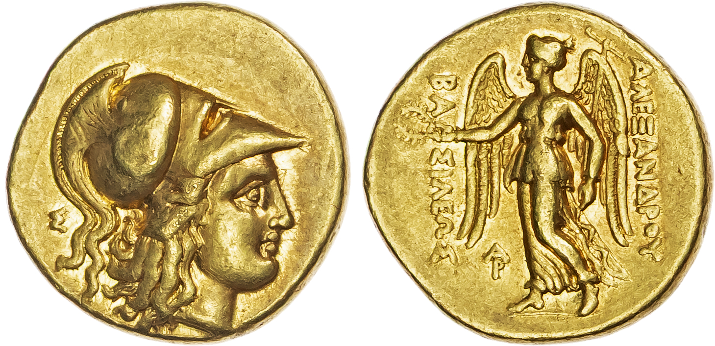 Kingdom of Macedon, Alexander the Great (336-323 BC) AV Stater, lifetime or early posthumous issue, Arados, c. 328-320 BC, 8.52g. Head of Athena right, wearing crested Corinthian helmet decorated with a serpent motif, Σ behind. Rev. BAΣIΛEΩΣ – ΑΛΕΞΑΝΔΡΟΥ, Nike standing left, holding wreath and stylis, AP monogram in left field. (Price 3315). About Extremely Fine.