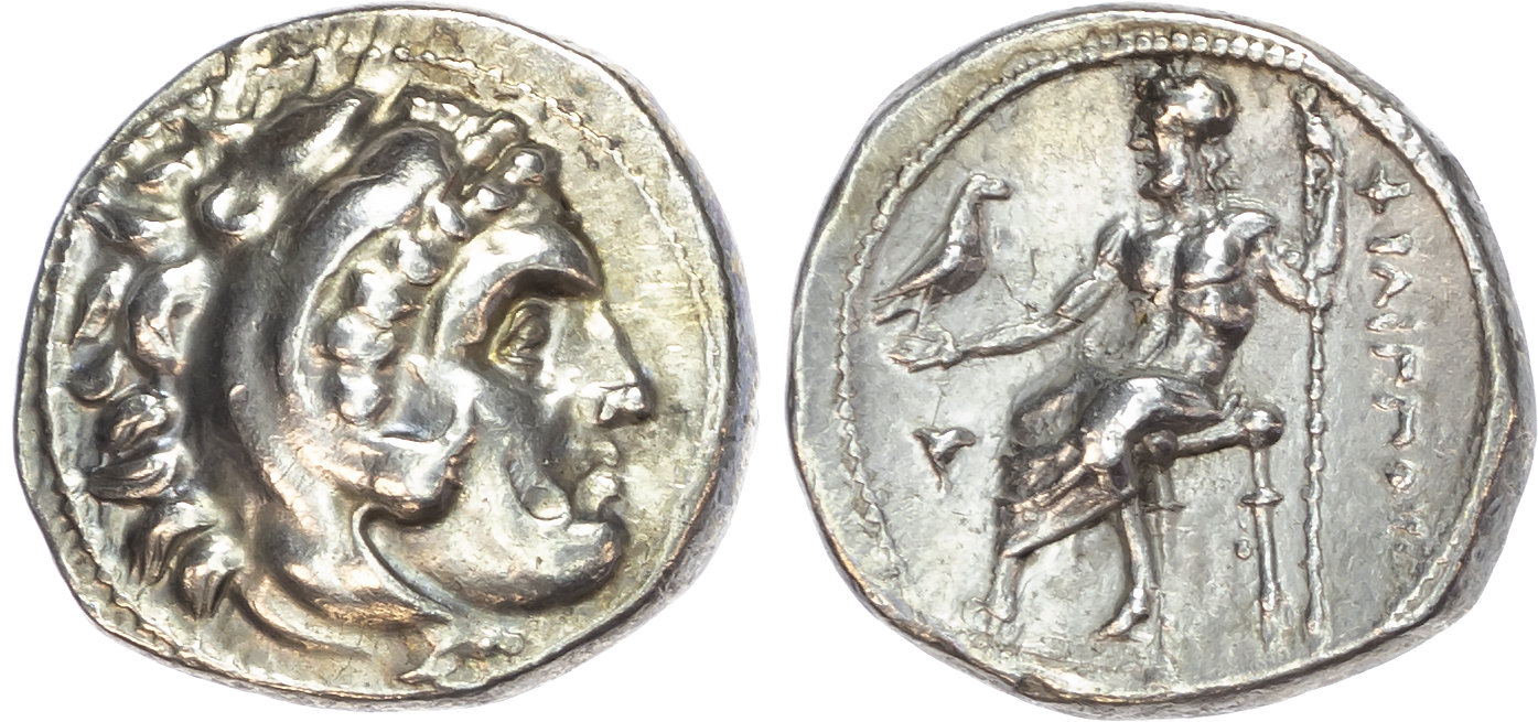 Kingdom of Macedon, Philip III (323-317 BC) Silver Drachm, Sardis, c. 323-319 BC, 4.28g. Obverse: Head of Herakles right, wearing a lionskin headdress. Reverse: ΦΙΛΙΠΠΟΥ, Zeus seated left, holding eagle and sceptre, rose to left, monogram below throne. (Price P66). Extremely Fine.