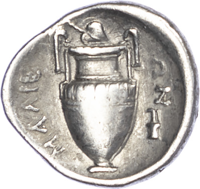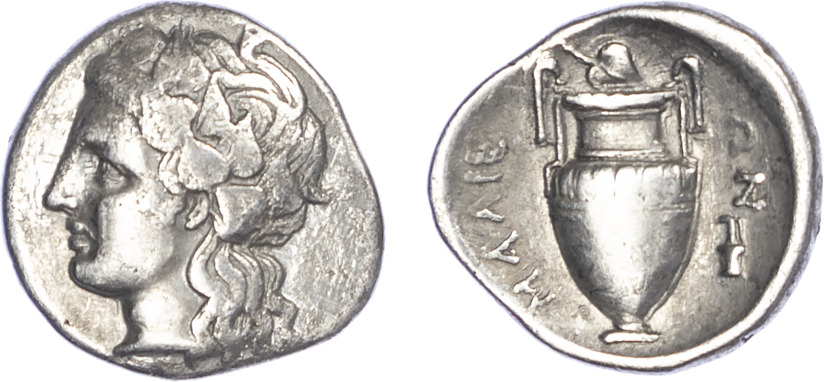 Thessaly. The Malienses at Lamia. Silver Hemidrachm, c. 400-344 BC. Obverse: Head of Dionysos facing left, wearing a wreath of vine leaves. Reverse: ΛΑΜΙΕ-ΩΝ, krater topped with a vine leaf,… Read more