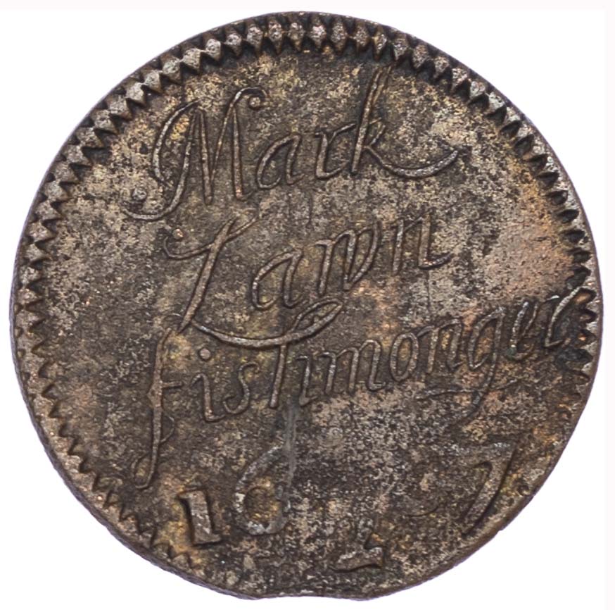 London, St. James’s Market, (Waterloo Place). Mark Lawn AE Halfpenny 1667. Plough / ‘fishmonger’. 2.34g/6h (N 8910; BW. 2539).