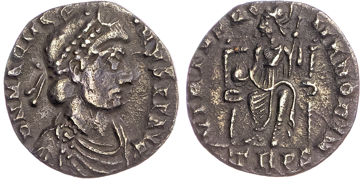 Magnus Maximus (AD 383-388) Silver Siliqua, Trier, 1.40g. Obverse: Pearl-diademed, draped and cuirassed bust of Magnus Maximus. Reverse: Roma seated on throne, holding globe and scepter. (RIC 84b). Good Very Fine.