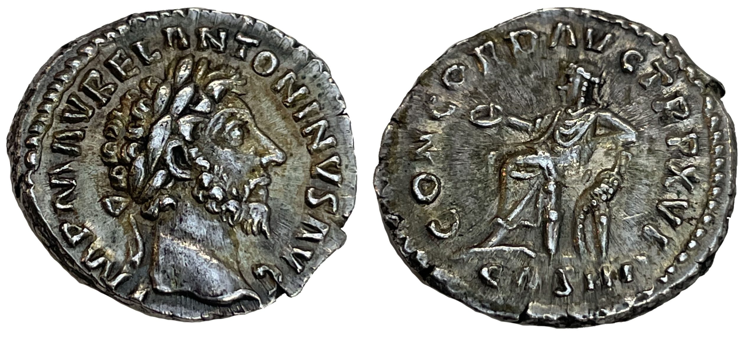 Marcus Aurelius (AD 161-180), Silver Denarius, Rome, AD 161-162, 3.34g. Obverse: Laureate head of Marcus Aurelius right. Reverse: Concordia seated left, holding patera and leaning on cornucopiae. (RIC 37). Good Very Fine.
