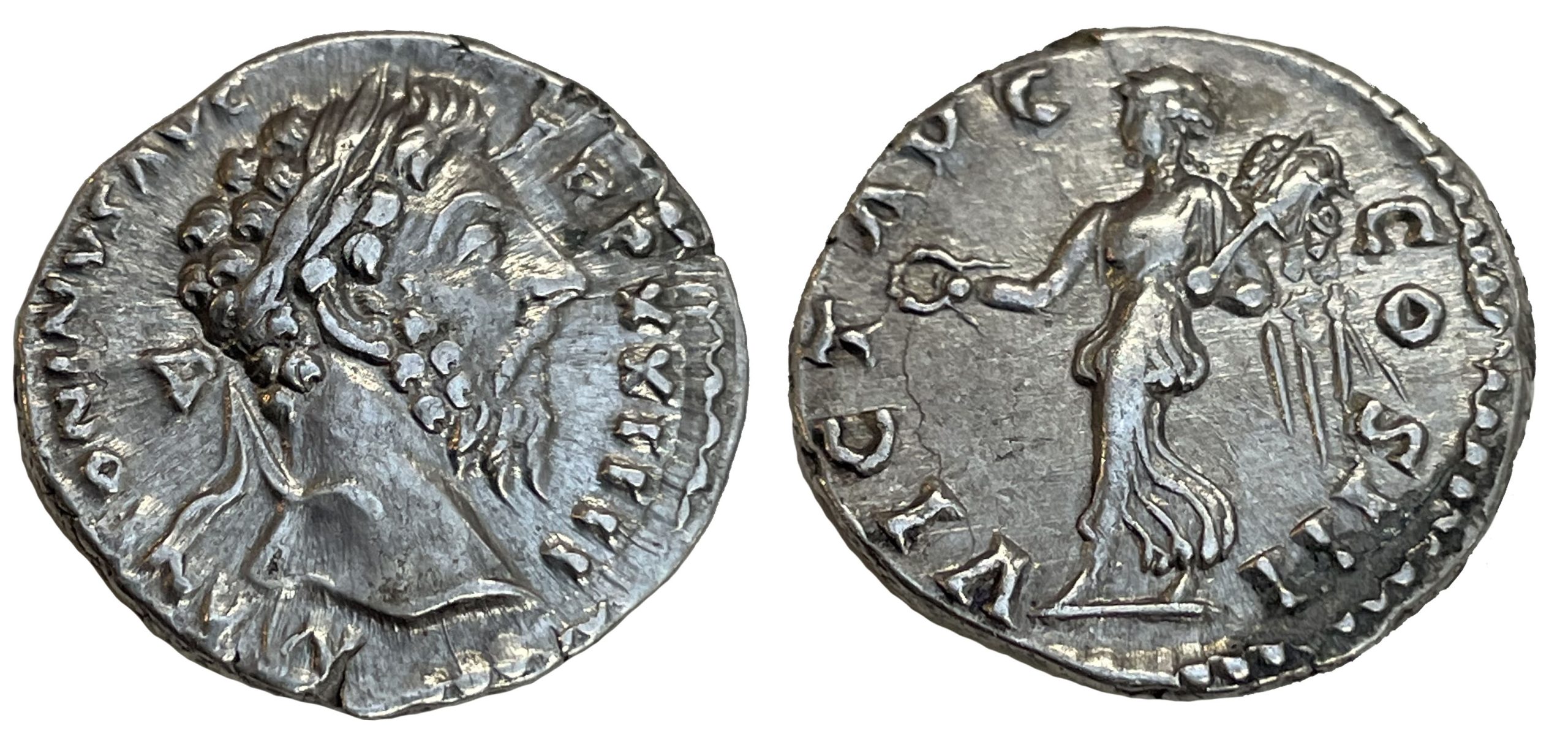 Marcus Aurelius (AD 161-180), Silver Denarius, Rome, AD 169-170, 3.10g. Obverse: Laureate head of Marcus Aurelius right. Reverse: Victory advancing left, holding wreath and trophy. (RIC 225). Good Very Fine.