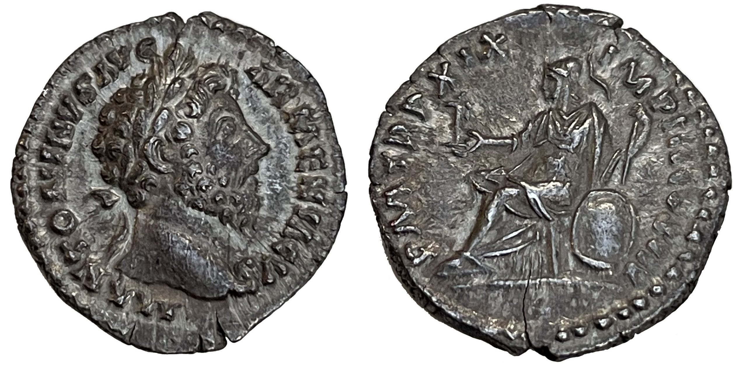 Marcus Aurelius (AD 161-180), Silver Denarius, Rome, AD 165, 2.73g. Obverse: Laureate head of Marcus Aurelius right. Reverse: Roma seated left, holding sceptre and Victory. (RIC 141; RSC 481). Good Very Fine. Pleasing cabinet tone.