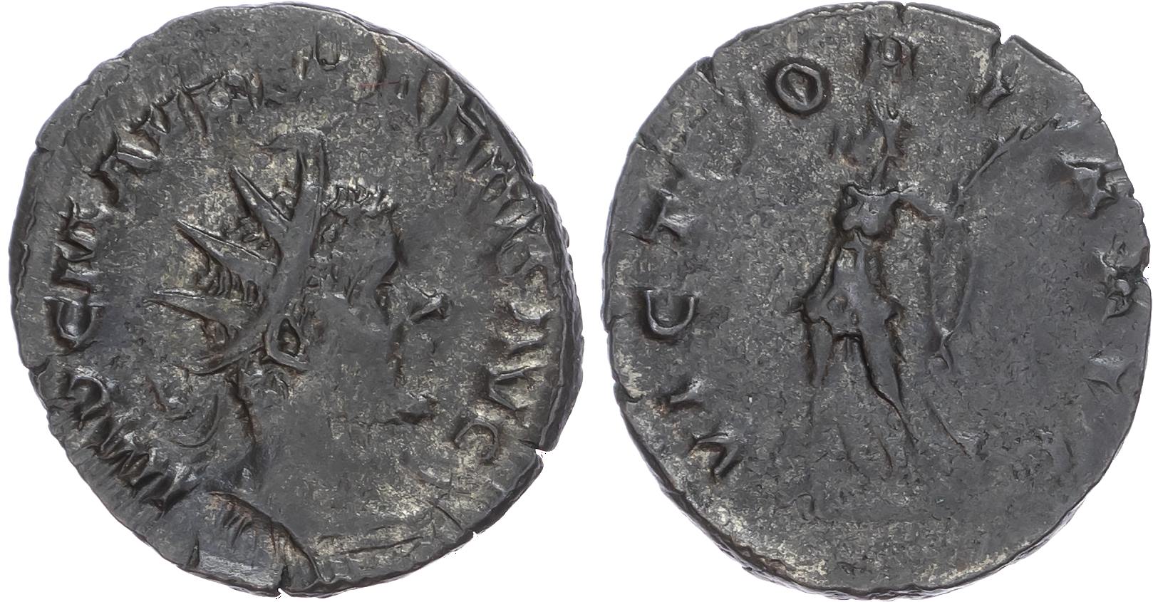 Marius (AD 269) Billon Antoninianus, Cologne, 2.69g. Obverse: IMP C M AVR MARIVS AVG, radiate and cuirassed bust of Marius right. Reverse: VICTO-RI-A AVG, Victory advancing left, holding wreath and palm. (RIC 487). Good Very Fine.