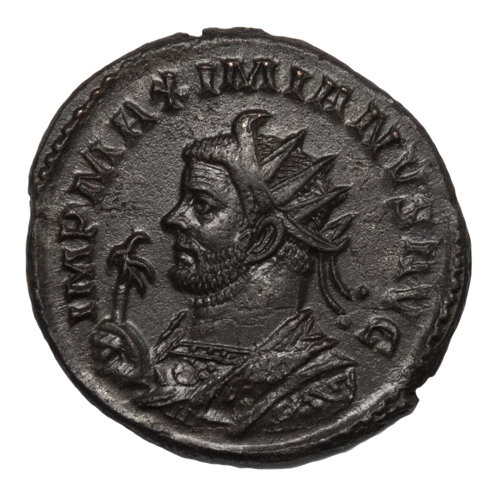 Obverse: IMP MAXIMIANVS AVG, radiate and mantled bust of Maximian facing right, holding an eagle-tipped sceptre.