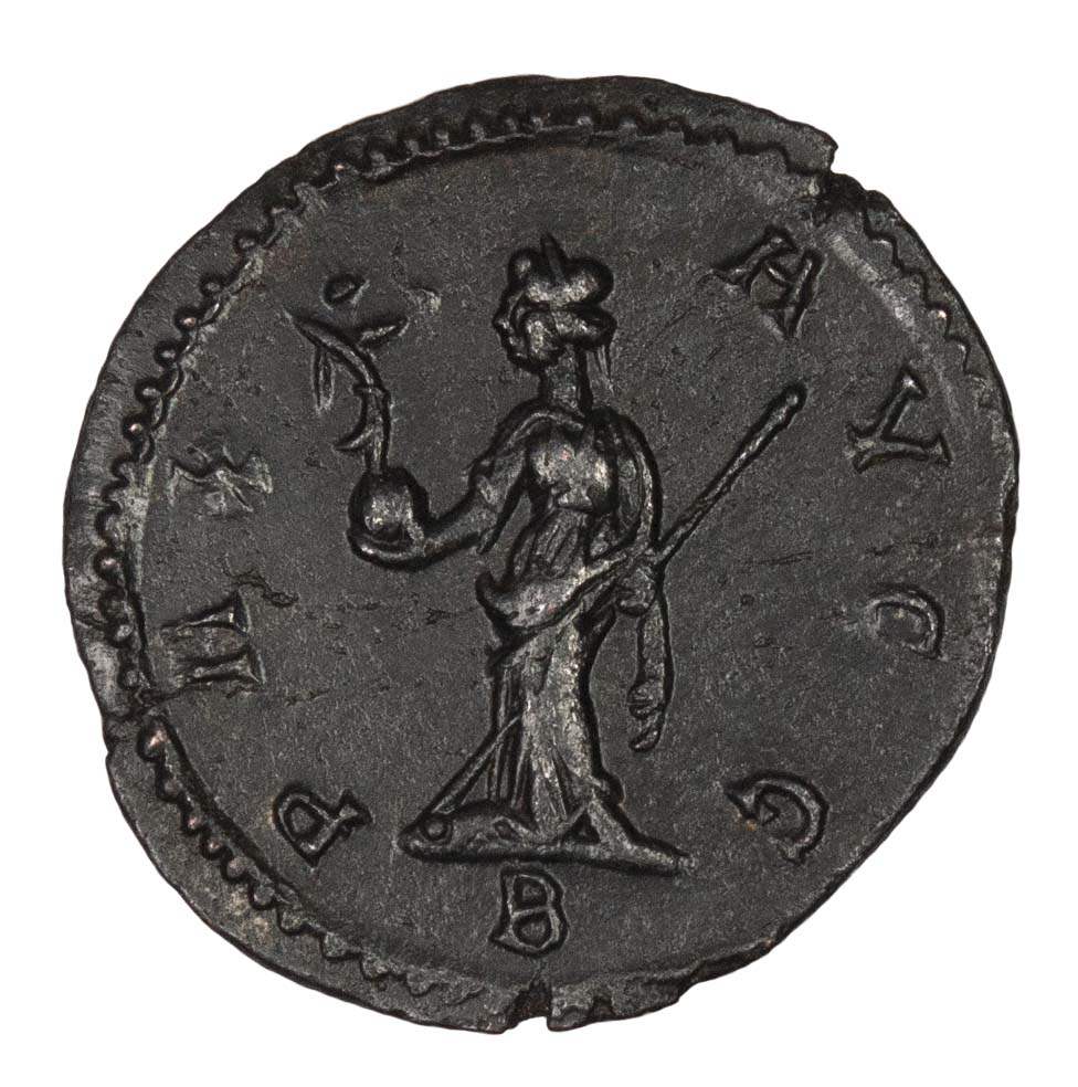 Reverse: PAX AVGG, Pax standing left, holding transverse sceptre and victory on globe, B in exergue.