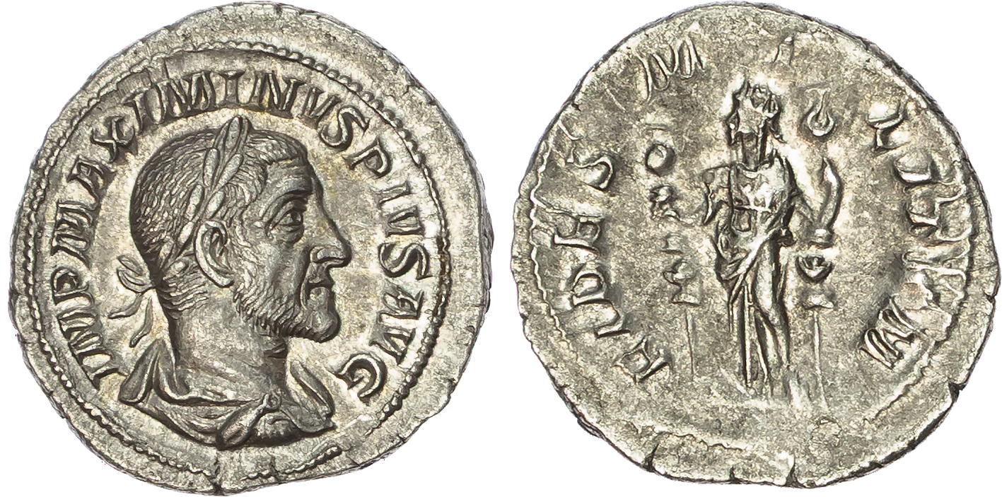 Maximinus Thrax (AD 235-236) Silver Denarius, Rome, AD 235-236, 3.21g. Obverse: laureate and draped bust of Maximinus Thrax right. Reverse: Fides standing left, holding a standard in each hand. (RIC 7a; RSC 7a; BMCRE 1). Very Fine.