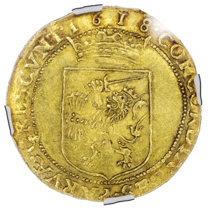 Netherlands, Utrecht, Grand Cavalier d’Or, 1618, type 1 struck on a large flan, ·MO· AV· PRO· CONF – OE· BELG· TRAIEC·, rider charging to right, in ex. coat of arms. Rev. CONCORDIA· RES· PARVÆ· CRESCVNT, crowned coat of arms, 9.90g (Delm. 967; V. 98.5; F. 286 (119); KM 15).