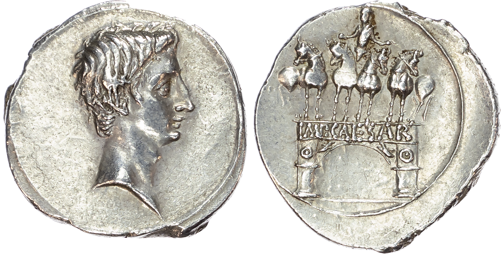 Octavian (44-27 BC) Silver Denarius, Italian mint, c. 30-29 BC, 3.71g. Obverse: Bare head of Octavian right. Reverse: Triumphal arch inscribed IMP CAESAR, topped with quadriga. (RIC 267; BMC 624). Extremely Fine. Bright.