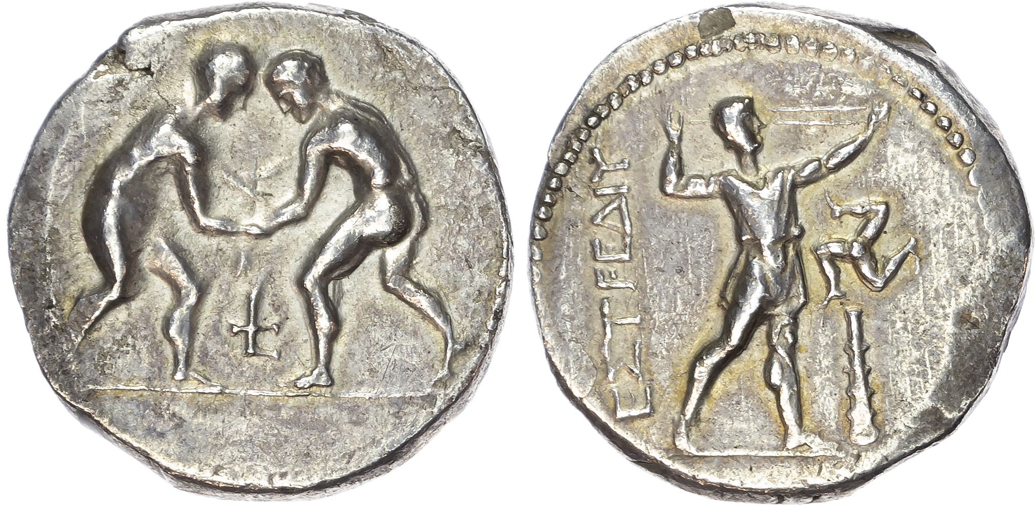 Pamphylia, Aspendos (c. 380-325 BC) Silver Stater, 9.80g. Obverse: Two wrestlers grappling, monogram between. Reverse: EΣTFEΔIIYΣ, slinger right, in throwing stance, triskeles to right. (SNG BN 115). Good Very Fine.