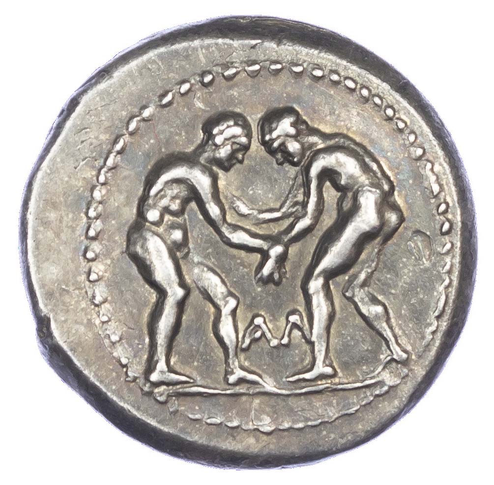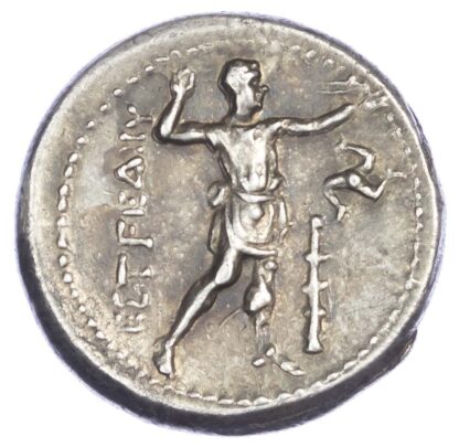 Reverse: ΕΣΤFΕΔΙΙΥΣ, slinger standing right, preparing to hurl shot, triskeles and vertical club to right.