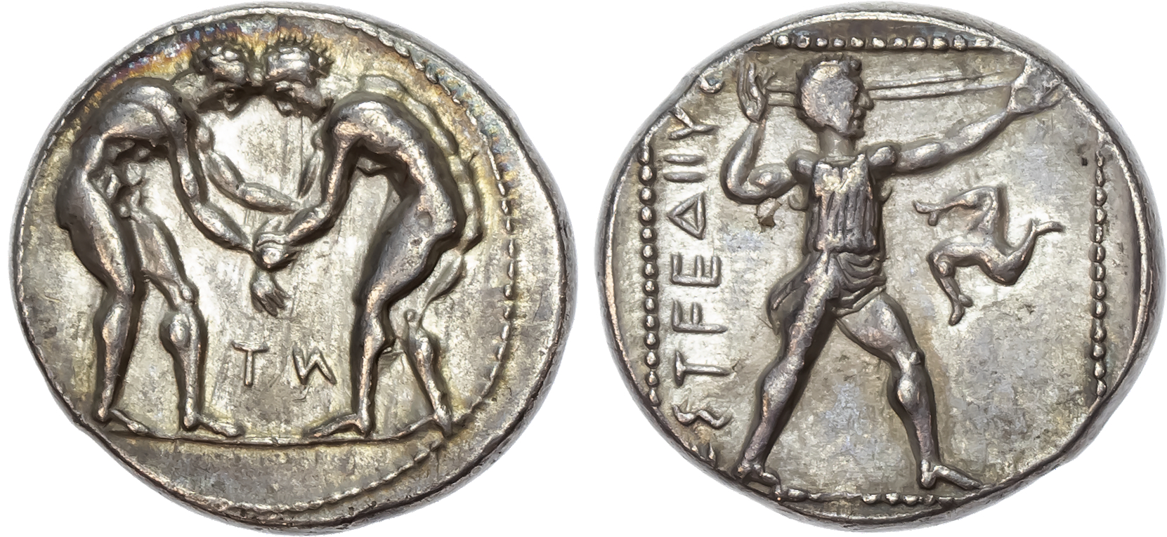Pamphylia, Aspendos (c. 3380/75 – 330/25 BC) AR Stater, 10.71g. Two wrestlers grappling, TN between. Rev. EΣTFEΔIIYΣ, slinger in throwing stance right, triskeles to right. (SNG VA 4556). About Extremely Fine.