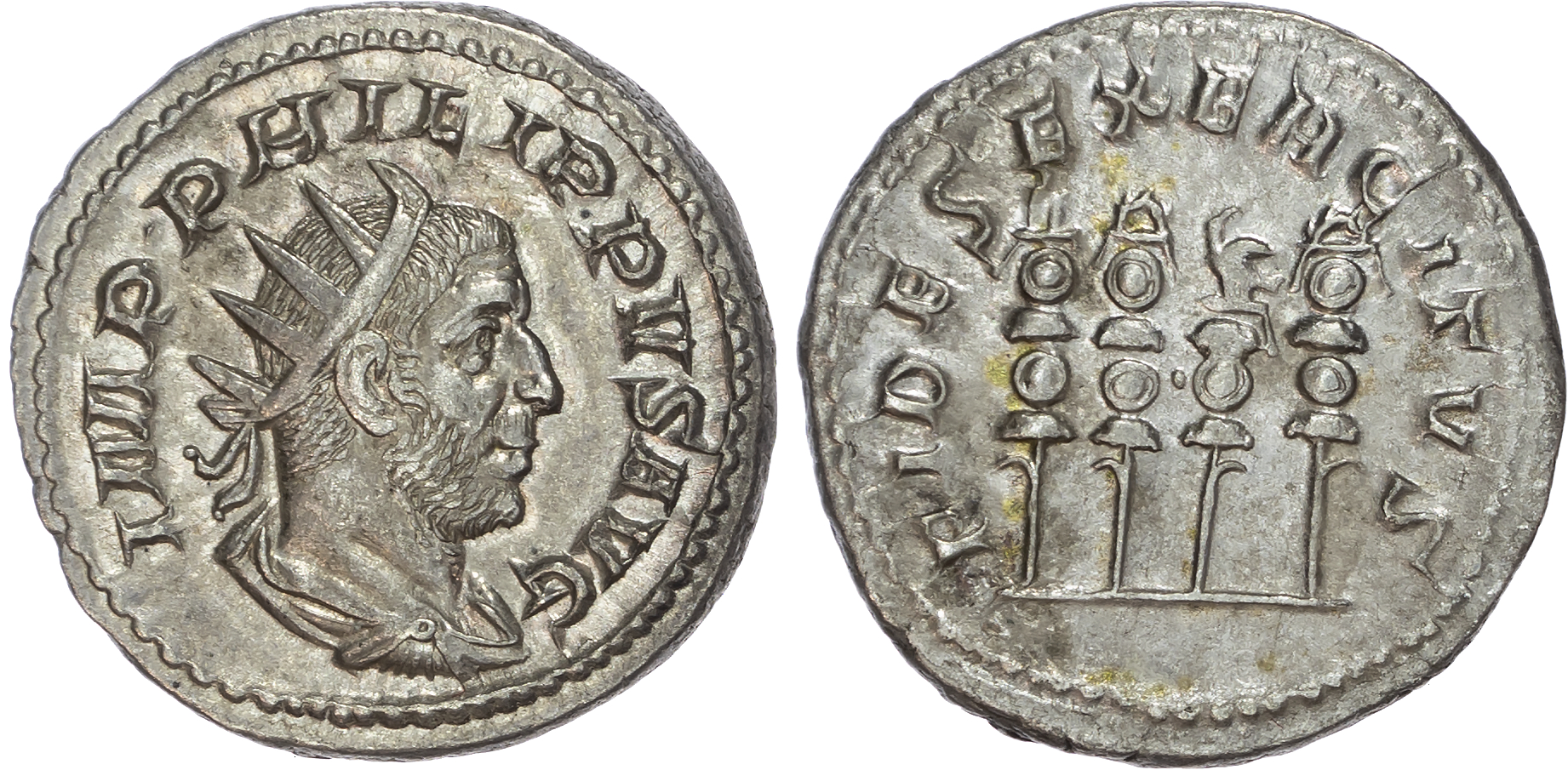 Philip I (AD 244-249) Silver Antoninianus, Rome, AD 248-249, 4.81g. Obverse: IMP PHILIPPVS AVG, radiate, draped and cuirassed bust of Philip I right. Reverse: FIDES EXERCITVS, four military standards. (RIC 52). Extremely Fine.