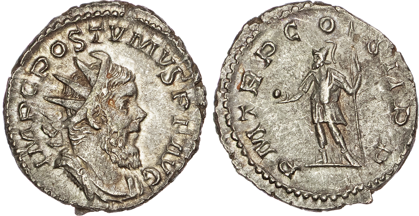 Postumus (AD 260-269), Silver Antoninianus, Trier, AD 261, 3.99g. Obverse: Radiate, draped and cuirassed bust of Postumus right. Reverse: Postumus in military attire, holding globe and spear. (RIC 54; RSC 243a). Very Fine.
