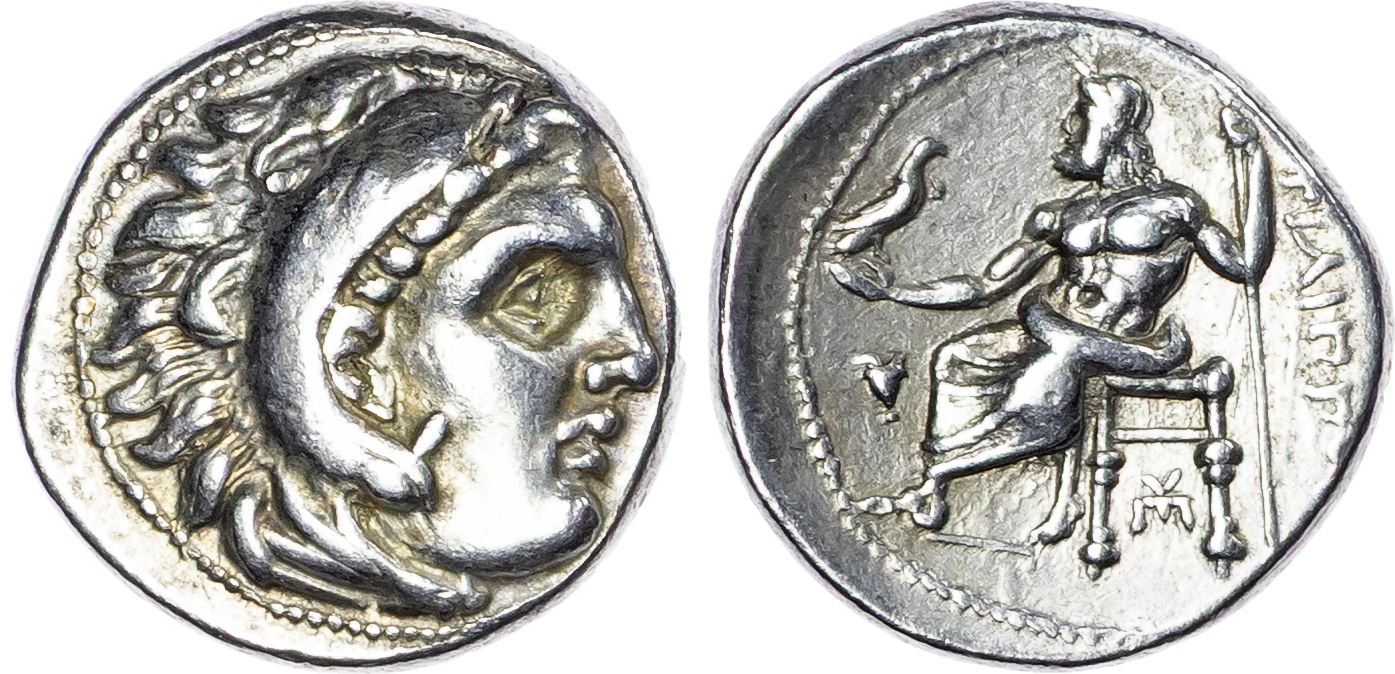 Types of Alexander the Great, Philip III (323-317 BC) Silver Drachm, Sardes, c. 323-318 BC, 4.30g. Obverse: Head of Herakles right, wearing lionskin headdress. Reverse: Zeus seated left, holding eagle and sceptre, rose in left field, monogram below throne. (Price P66). Good Very Fine.