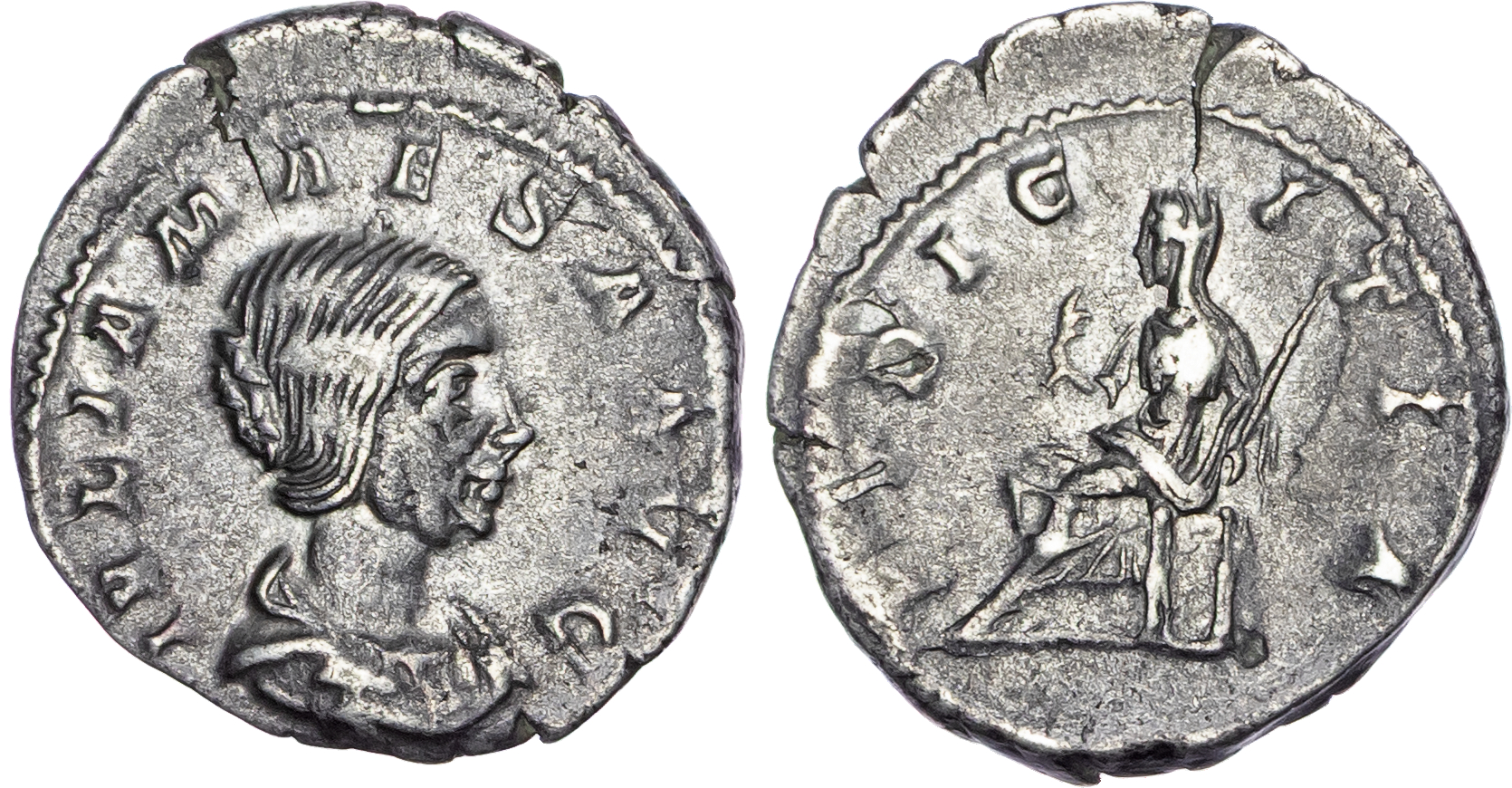 Julia Maesa (Grandmother of Elagabalus) Silver Denarius, Rome, AD 221-222, 2.79g. Obverse: Draped bust of Julia Maesa right. Reverse: Pudicitia seated left, drawing veil over face and holding sceptre. Very Fine.
