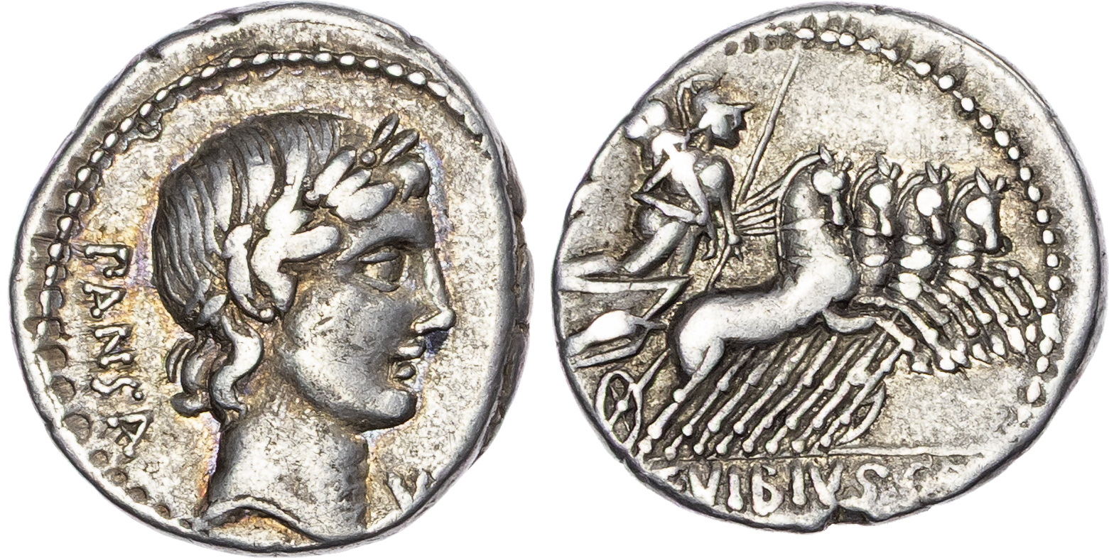 Roman Republic, C. Vibius C. f. Pansa, Silver Denarius, Rome, c. 90 BC, 3.77g. Obverse: Laureate head of Apollo right. Reverse: Minerva, holding trophy, spear and reins, driving galloping quadriga left. (Crawford 342/5b). Very Fine.