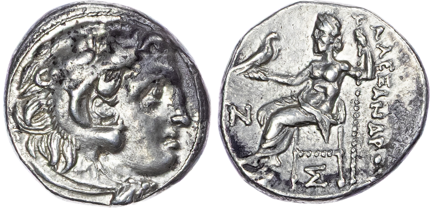 Kingdom of Macedon, Alexander the Great (336-323 BC) Silver Drachm, posthumous issue, Kolophon, 310-301 BC, 4.28g. Obverse: Head of Herakles right, wearing lionskin headdress. Reverse: Zeus seated left, holding eagle and sceptre; monogram Ν in left field and monogram Σ below throne. (Price 1802). Good Very Fine.
