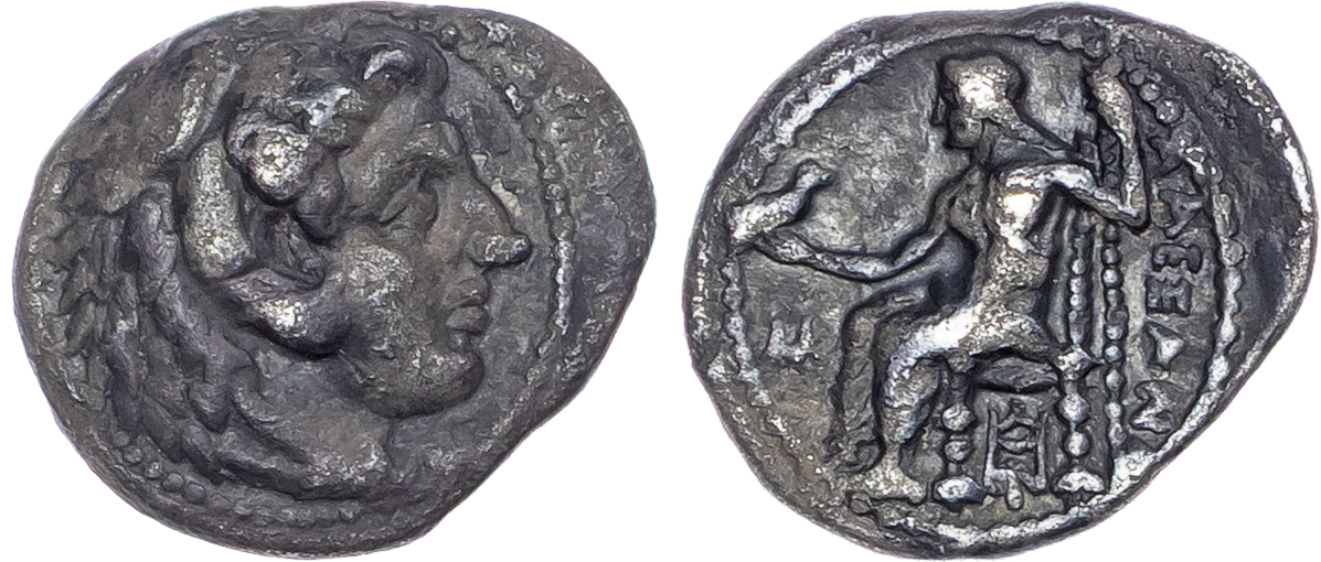 Kingdom of Macedon, Alexander the Great (336-323 BC) Silver Hemidrachm, 1.87g. Obverse: Head of Herakles right, wearing lionskin headdress. Reverse: Zeus seated left, holding eagle and sceptre, monogram in left field and monogram below throne. (Price 3694). Very Fine.