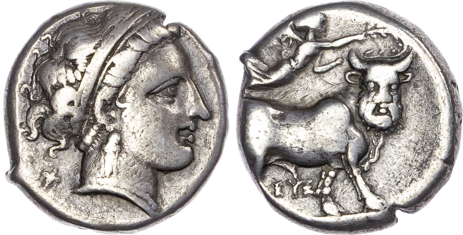 Campania, Neapolis (c. 300 BC) Silver Didrachm, 7.11g. Obverse: Head of nymph right. Reverse: Man-headed bull walking right, above, Nike flying right, placing wreath on bull’s head. (HN Italy 579). Very Fine.