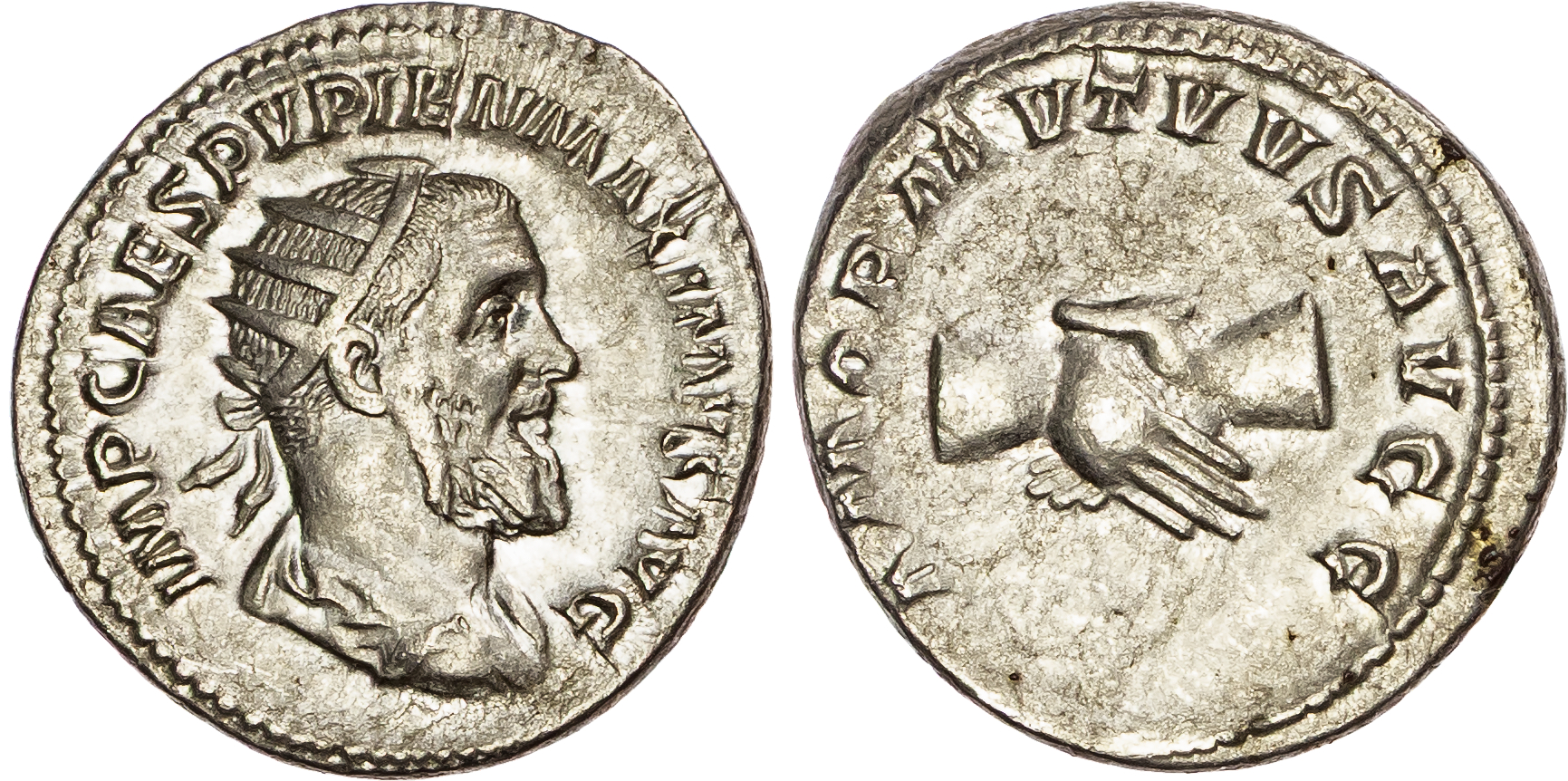Pupienus (AD 238), Silver Antoninianus, Rome, AD 238, 4.35g. Obverse: Radiate, draped and cuirassed bust pf Pupienus right. Reverse: Clasped right hands. (RIC 9a; BMC 77). Very Fine.
