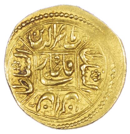 Qajar, Nasir al-Din (AH 1264-1313 / 1848-1896 AD), gold Toman, AH 1271 / 1855 AD, ornate obverse design, with the word ‘Qajar’ in central square. Rev. Qazvin, 3.30g (KM 853). Good Very Fine to Extremely Fine, with a minor area of peripheral weakness.
