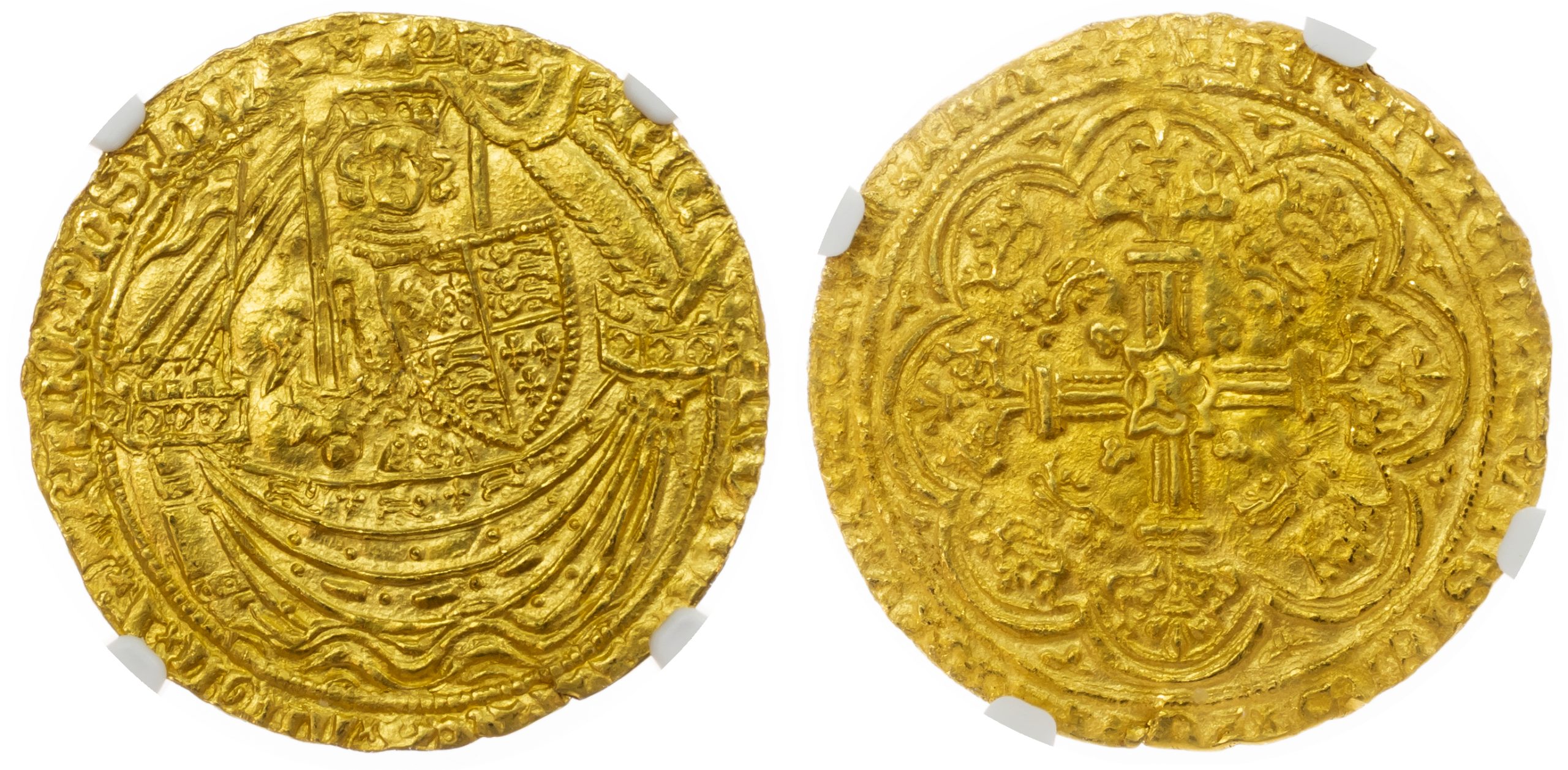Richard II (1377-99), Noble, Calais, type IIIa, French title resumed, m.m. cross pattée, king standing facing in ship holding sword and shield, pennant on stern, rev. floriate cross extending from a central panel containing a letter r crowned leopard in each angle (N.1308; S.1662). A superbly struck example which has been very conservatively graded by NGC as MS62. Richard II Calais Noble – NGC MS62