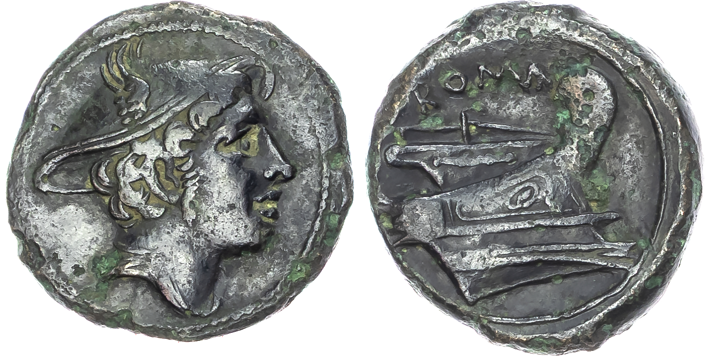 Roman Republic, Anonymous, Bronze Semuncia, 217-215 BC, 5.35g. Obverse: Draped bust of Mercury right, wearing petasus. Reverse: ROMA, prow of galley right. (Crawford 38/7; Sydenham 87). Fine.
