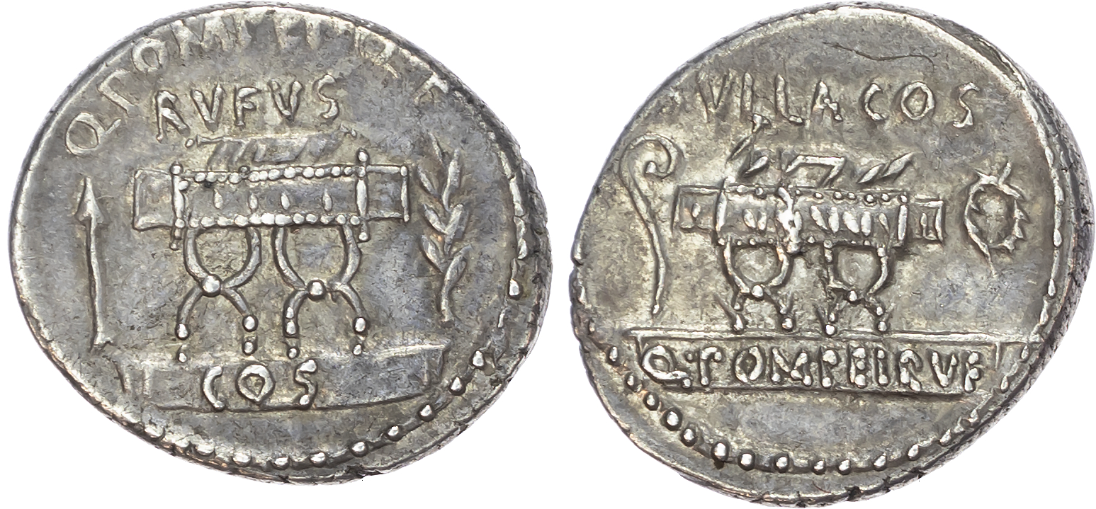 Roman Republic, Q. Pompeius Rufus (54 BC) AR Denarius, Rome, 3.62g. Obverse: Q•POMPEI•Q•F / RVFVS, curule chair, laurel branch to right, arrow to left, COS on tablet below. Reverse: SVLLA•COS, curule chair, wreath to right, lituus to left, Q•POMPEI•RVF on tablet below. (Crawford 434/2; Sydenham 909). Extremely Fine. Some residual lustre.