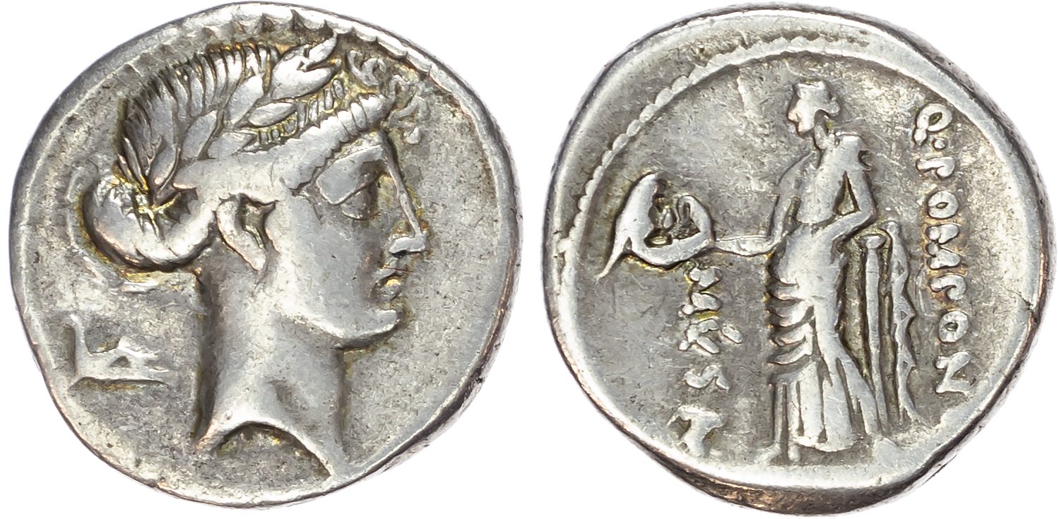 Roman Republic, Q. Pomponius Musa (66 BC) Silver Denarius, 3.96g. Obverse: Laureate head of Apollo right, sceptre behind, banker’s mark in to right. Reverse: Q•POMPONI – MV-SA, Melpomene, the Muse of tragedy, facing, holding club and tragic mask. (Crawford 410/4; RSC 14). Very Fine.